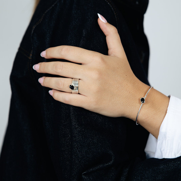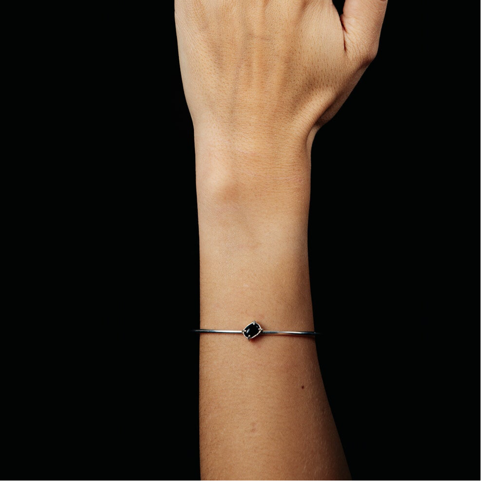 Een eerbetoon aan de schoonheid van het gewone, vertaald in edelmetaal. De Coffee Cuff uit de Mundane collectie is met de hand vervaardigd uit 925 zilver. De slanke zilveren armband (2 mm dik) omarmt de pols met een ingetogen glans en draagt een ovale cabochonsteen van 5 × 7 mm — verkrijgbaar in onyx, citrien, rozenkwarts of granaat.
