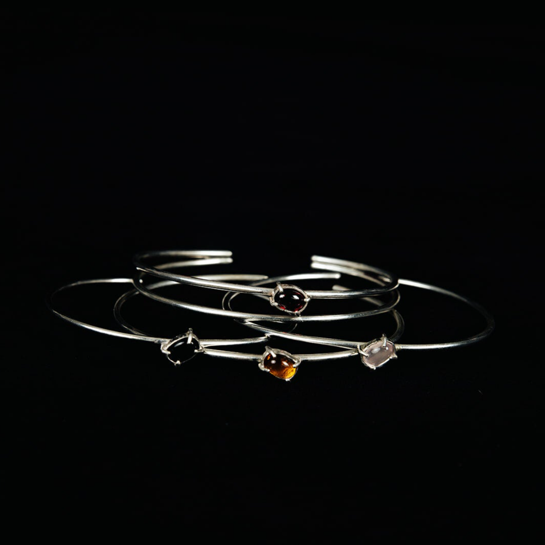 Een eerbetoon aan de schoonheid van het gewone, vertaald in edelmetaal. De Coffee Cuff uit de Mundane collectie is met de hand vervaardigd uit 925 zilver. De slanke zilveren armband (2 mm dik) omarmt de pols met een ingetogen glans en draagt een ovale cabochonsteen van 5 × 7 mm — verkrijgbaar in onyx, citrien, rozenkwarts of granaat.