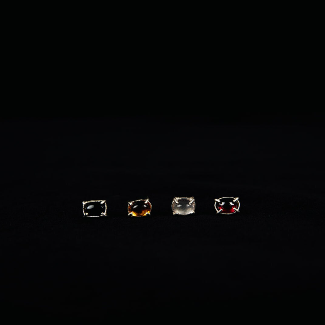 Een klein accent van stilte en licht. De Coffee Stud uit de Mundane collectie is met de hand vervaardigd uit 925 zilver en draagt een ovale cabochonsteen van 5 × 7 mm — verkrijgbaar in onyx, citrien, rozenkwarts of granaat.