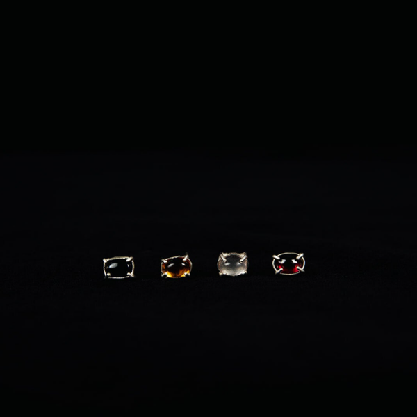 Een klein accent van stilte en licht. De Coffee Stud uit de Mundane collectie is met de hand vervaardigd uit 925 zilver en draagt een ovale cabochonsteen van 5 × 7 mm — verkrijgbaar in onyx, citrien, rozenkwarts of granaat.