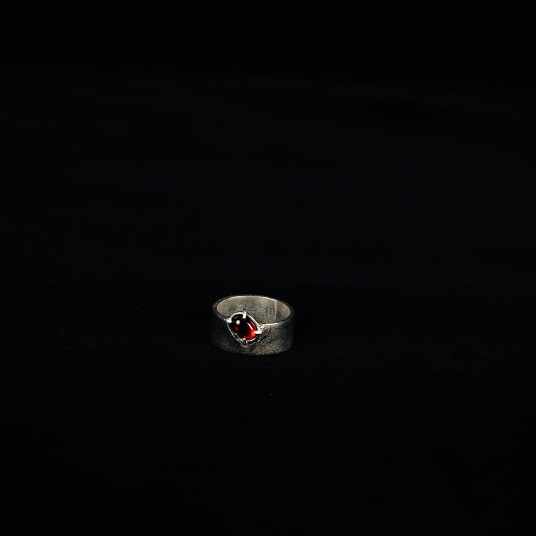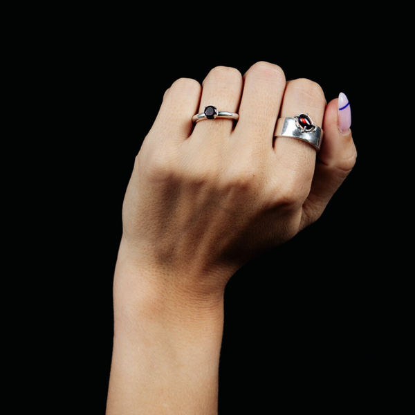 Een evenwicht tussen statement en eenvoud, geïnspireerd door de stille schoonheid van het alledaagse. De Coffee Ring uit de Mundane collectie is met de hand vervaardigd uit 925 zilver. Op de zilveren ringband is een ovale cabochonsteen van 5 × 7 mm — onyx, citrien, rozenkwarts of granaat — schuin gesoldeerd, wat het ontwerp een subtiele eigenzinnigheid geeft.