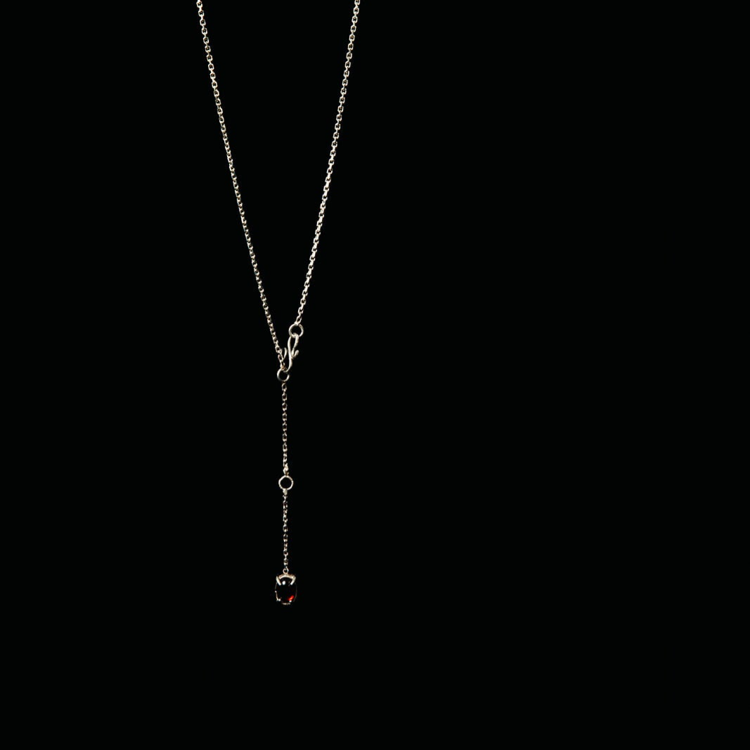Een ode aan het losse draadje dat blijft hangen aan een trui — een klein spoor van beweging, van iets dat geleefd werd. De Loose Thread Ketting uit de Mundane collectie is met de hand vervaardigd uit 925 zilver en opgebouwd uit een fijne, luchtige schakelketting. In het midden hangt een ovale cabochonsteen van 5 × 7 mm — onyx, citrien, rozenkwarts of granaat — als een subtiel contrast tussen zachtheid en structuur.