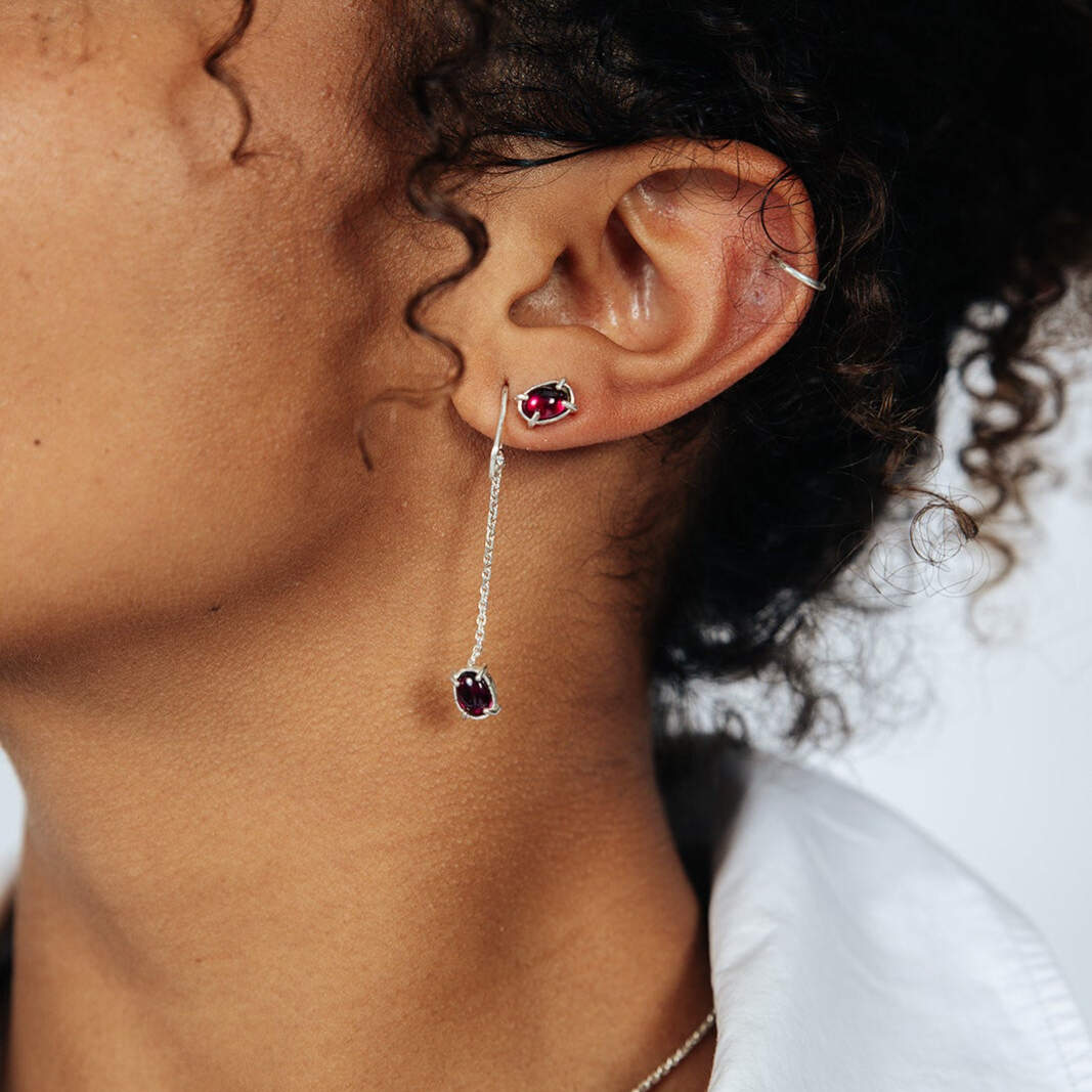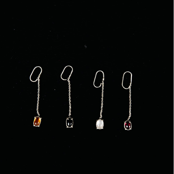 Een vertaling van dat ene losse draadje aan die warme trui dat zacht meebeweegt met elke stap — een detail dat tegelijk toevallig en zorgvuldig lijkt. De Loose Thread Earrings uit de Mundane collectie zijn met de hand vervaardigd uit 925 zilver en bestaan uit fijne, beweeglijke schakels die licht vangen bij elke beweging. Onderaan bungelt een ovale cabochonsteen van 5 × 7 mm — onyx, citrien, rozenkwarts of granaat — als een klein, glanzend eindpunt van de draad.