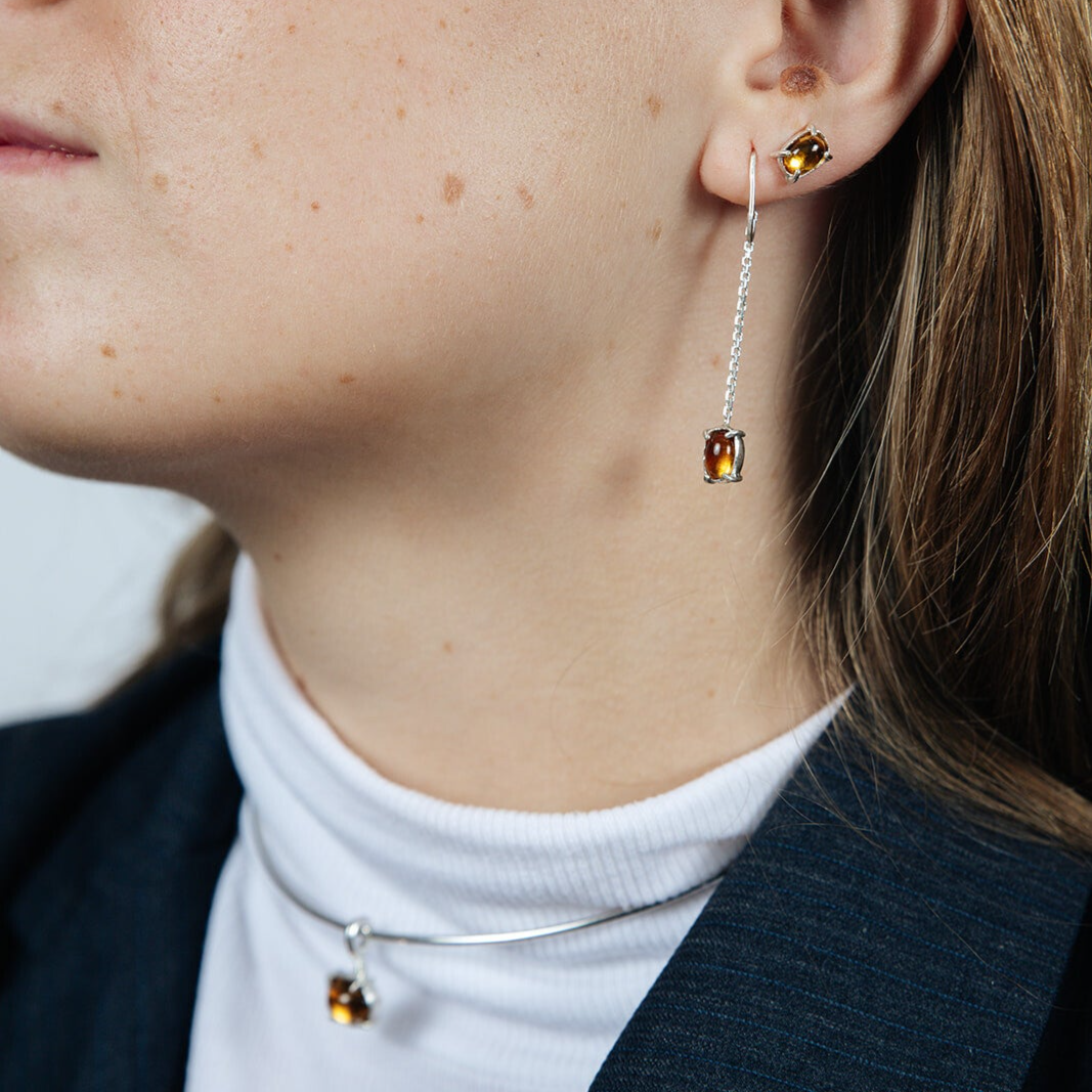 Een vertaling van dat ene losse draadje aan die warme trui dat zacht meebeweegt met elke stap — een detail dat tegelijk toevallig en zorgvuldig lijkt. De Loose Thread Earrings uit de Mundane collectie zijn met de hand vervaardigd uit 925 zilver en bestaan uit fijne, beweeglijke schakels die licht vangen bij elke beweging. Onderaan bungelt een ovale cabochonsteen van 5 × 7 mm — onyx, citrien, rozenkwarts of granaat — als een klein, glanzend eindpunt van de draad.