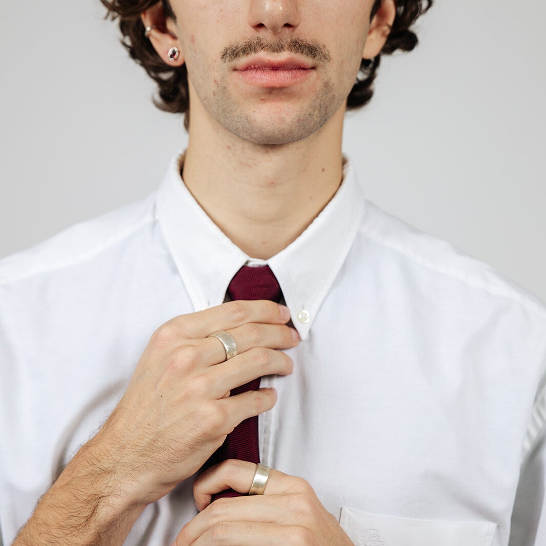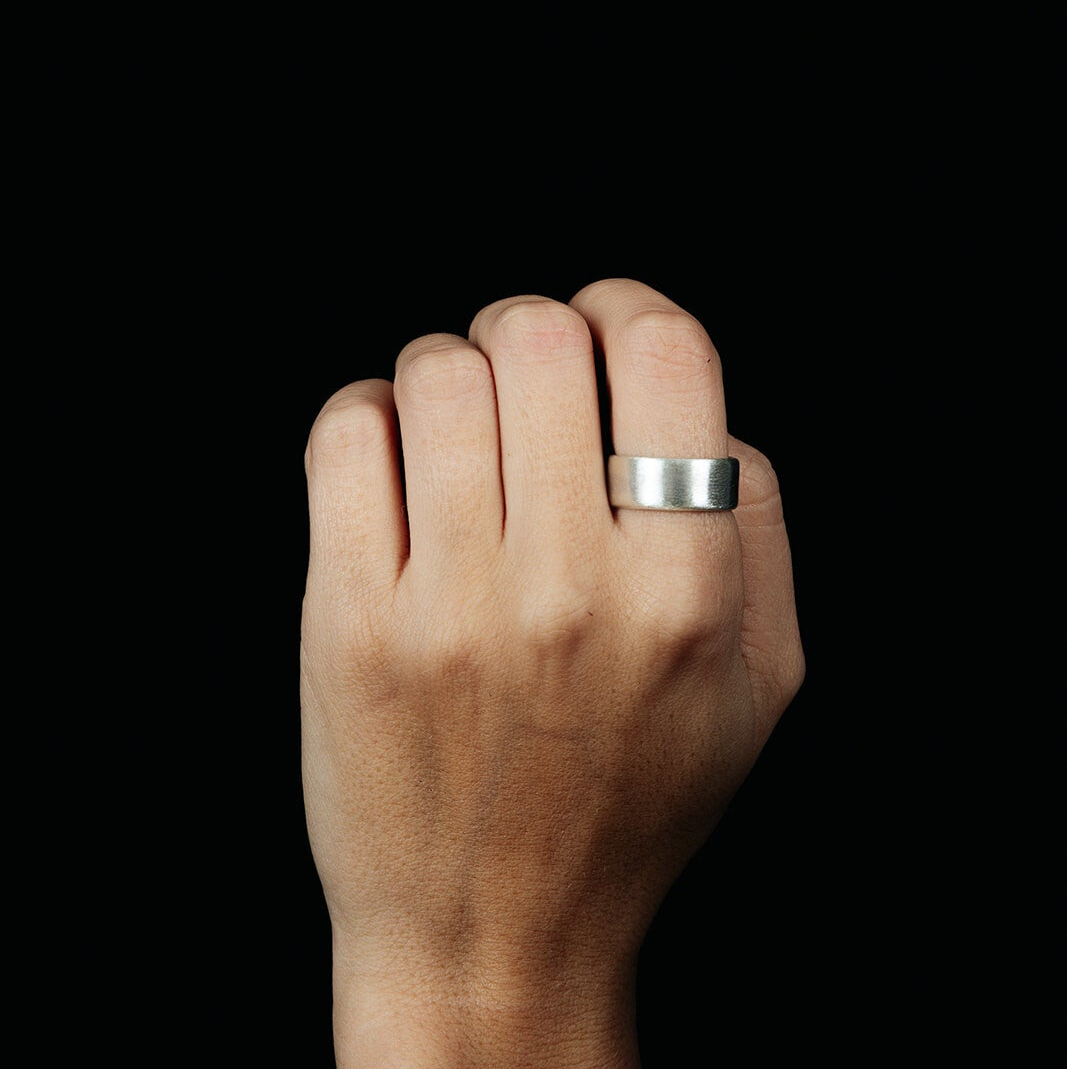 Een ode aan oppervlakken die stilletjes hun glans verliezen — zoals een veelgebruikt bestek, een deurklink, of een computer die dagelijks heen en weer reist naar het werk. De Matt Ring uit de Mundane collectie is met de hand vervaardigd uit 925 zilver en afgewerkt met een zachte, matte textuur die doet denken aan iets dat door gebruik juist mooier wordt.